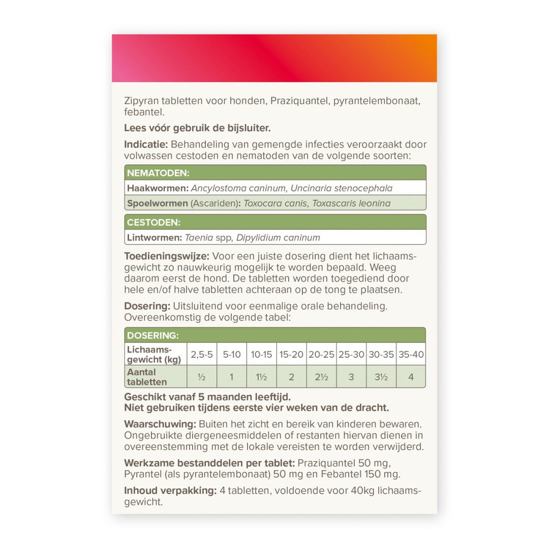 Voor een juiste dosering dient het lichaamsgewicht zo nauwkeurig mogelijk te worden bepaald. Weeg daarom eerst de hond. De tabletten worden toegediend door hele en/of halve tabletten achteraan op de tong te plaatsen. Lichaamsgewicht (kg) / aantal tabletten: 2,5 - 5: ½ tablet 5 - 10: 1 tablet 10 - 15: 1½ tablet 15 - 20: 2 tabletten 20 - 25: 2½ tablet 25 - 30: 3 tabletten 30 - 35: 3½ tablet 35 - 40: 4 tabletten Hoe vaak een wormkuur toegepast dient te worden hangt af van o.a. de leeftijd en de omgeving van het dier. Gemiddeld is dit 4x per jaar. Indien uw hond meegaat op vakantie, is het verstandig navraag te doen of voor het betreffende land een ander advies geldt.