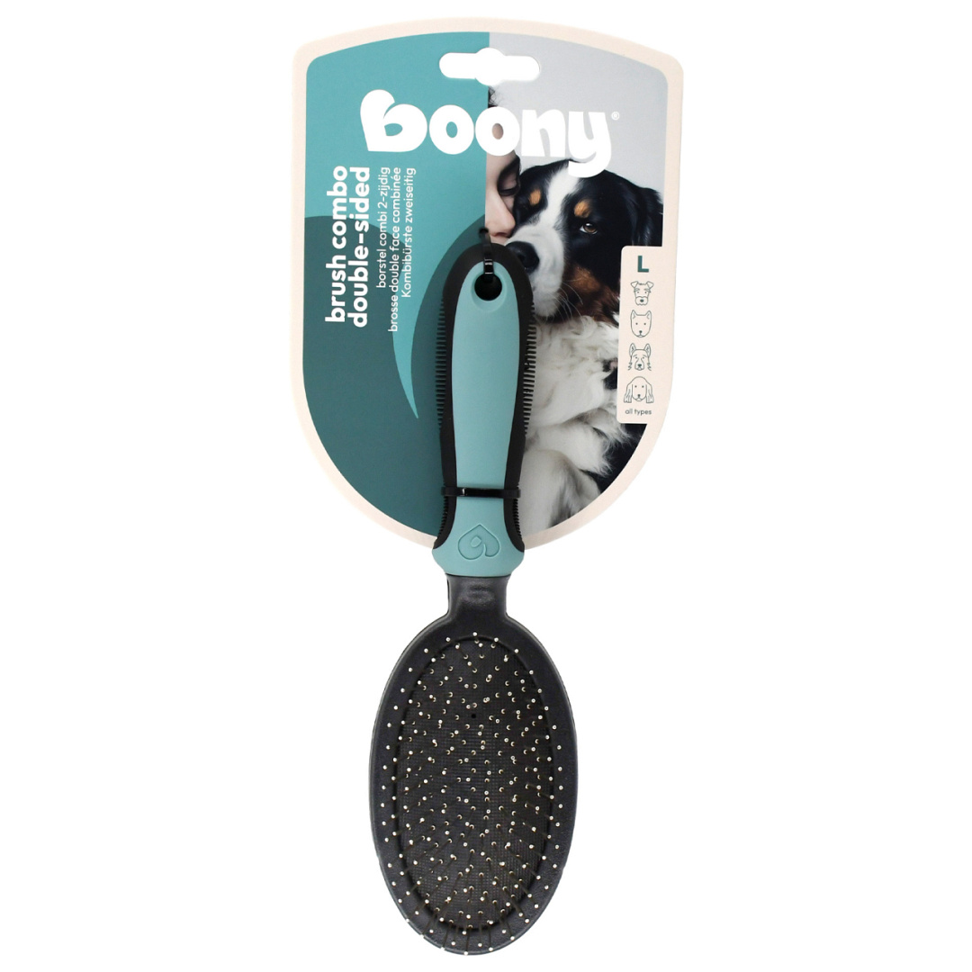 Met deze praktische Boony 2-zijdige combi-borstel heb je twee essentiële borstels in één handig product. Ideaal voor hondenbezitters die gemak, effectiviteit en veelzijdigheid zoeken. De borstel combineert een nylon zijde voor het verwijderen van vuil en een stalen zijde voor het losmaken van dode en losse haren.