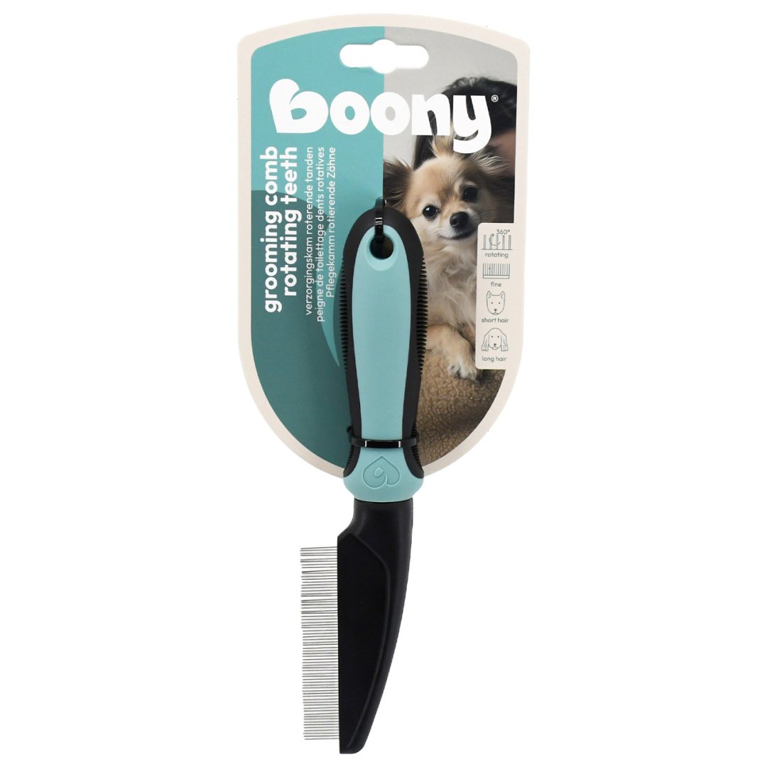 Deze Boony Verzorgingskam met fijne tandwijdte is perfect voor het verzorgen van honden met een lange, dunne vacht. De kam maakt de vacht los en verwijdert effectief losse haren, vuil en beginnende klitten. Door de roterende tanden glijdt de kam soepel door de vacht en wordt het kammen een stuk comfortabeler.