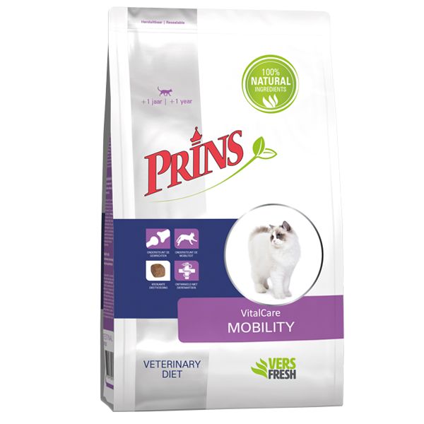 Prins VitalCare Veterinary Diet Mobility is een krokante dieetvoeding voor katten met gewrichtsproblemen. Deze volledige dieetvoeding bevat ingrediënten die de gewrichten ondersteunen, een positieve invloed hebben op de beweeglijkheid van jouw kat en bijdragen aan een gezonde huid en glanzende vacht.
