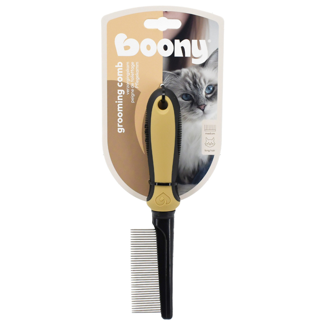 Deze Boony Verzorgingskam met gemiddelde tandafstand is ideaal voor katten met een langere vacht. Tijdens het kammen maak je de vacht los, waardoor je eenvoudig losse haren, vuil en lichte klitten verwijdert. Zo houd je de vacht van je kat fris, verzorgd en goed onderhouden, zonder stress.