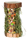 Natuurhouten toren met bergweidehooi en knaagstokje. Geschikt voor kleine knaagdieren en konijnen. Afm. 13 x 17 x 13 cm.