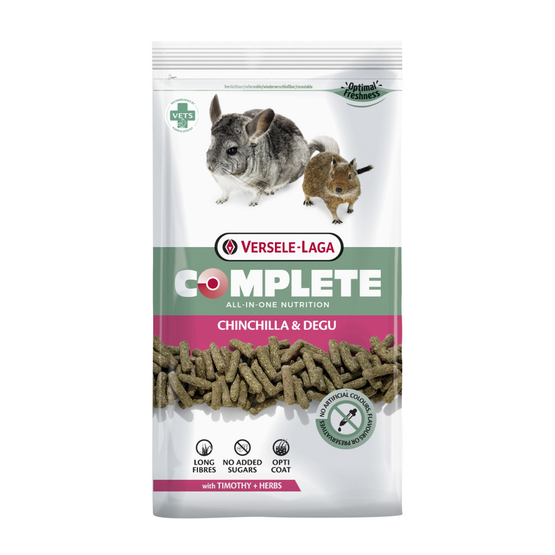 Versele-Laga Complete Chinchilla & Degu zijn vezelrijke geëxtrudeerde brokjes voor chinchilla’s en degoes. All-in-one, dus geen selectief eetgedrag. Met lijnzaad (omega 3), ideaal voor de vacht en lange vezels, optimaal voor de tanden. Zonder toegevoegde suikers.