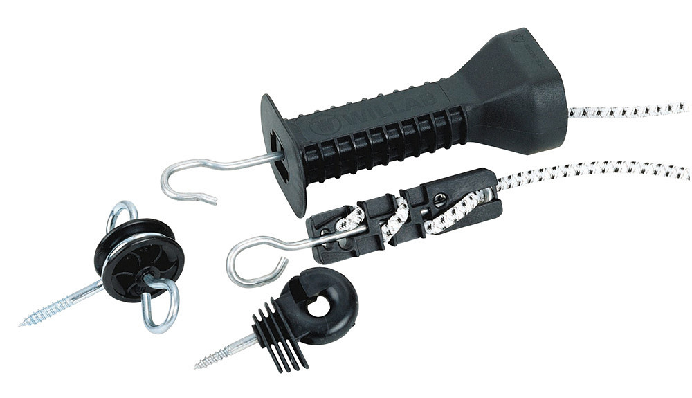 Gemaakt van duurzaam elastiek met daarin stroomgeleidedraden. Set bestaat uit: poortgreep, elastiek, ringisolator en poortgreepanker.