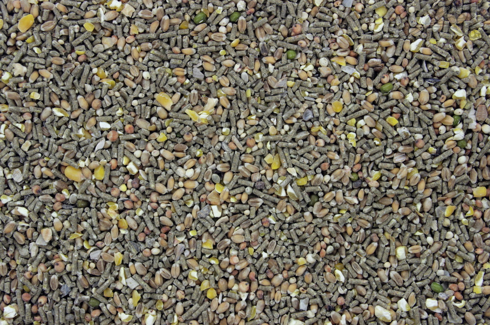 Korrels (bio tarwe, bio sojaschilfers, bio mais, bio zonneschilfers, bio gerst, bio lupinen, bio erwten, bio luzerne, bio sesamschilfers, calciumcarbonaat, natrium-chloride), tarwe, mais, kippengrit, sorghum, katjang idjoe, hennepzaad, milletzaad.
